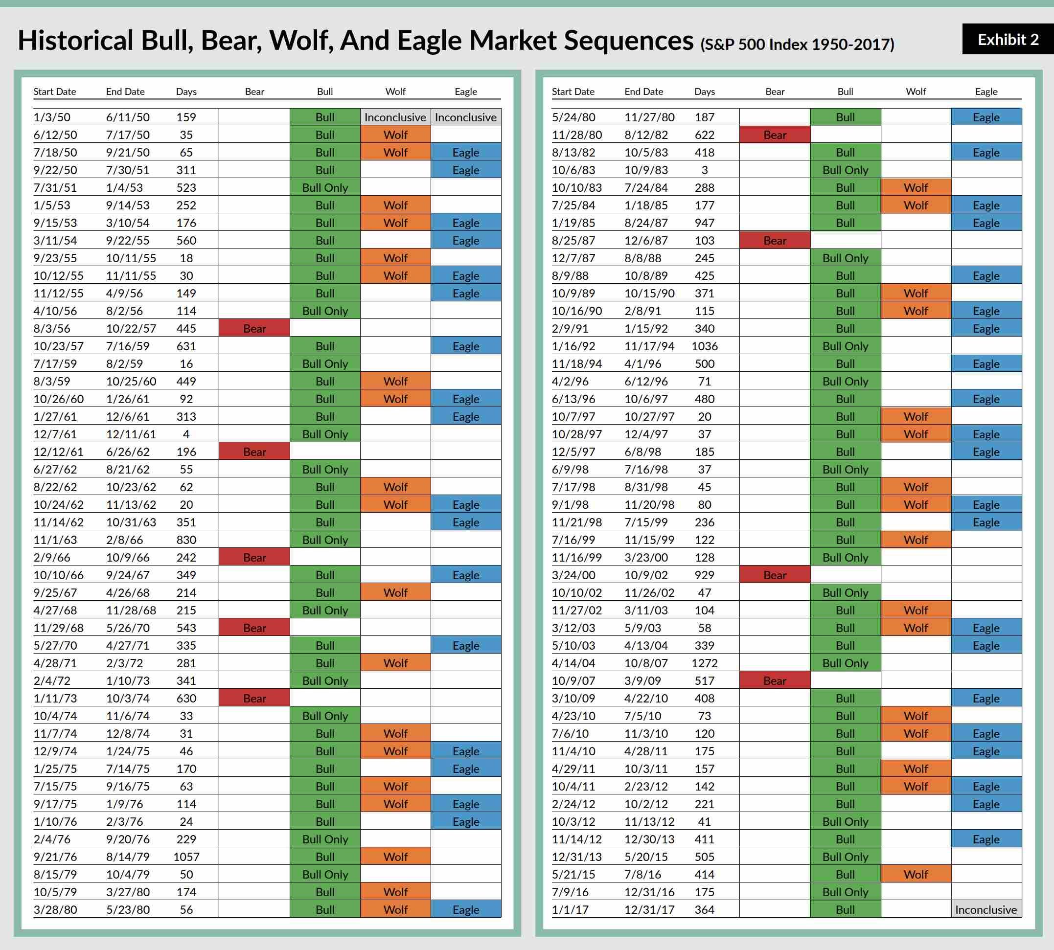 在牛和熊这两个经典角色之外,他补上了另外两位一直被忽略、但却异常常见的主角——狼市(Wolf)和鹰市(Eagle)。这不是为了玩概念,而是源于他对 1950 年至 2017 年标普 500 每一帧日线图的逐条拆解与分类,得出的统计真相。