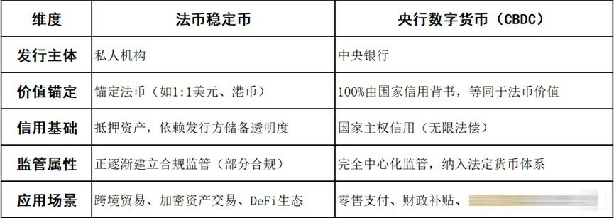 法币稳定币与央行数字货币(CBDC)作为数字货币的两种核心形态,既有技术上的相似性,又在发行主体、信用背书、应用场景等方面存在显著差异。