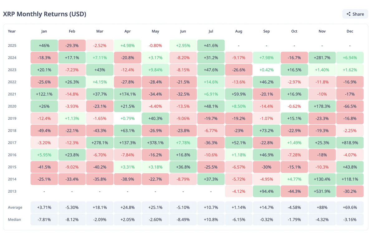 截至目前,2025年7月XRP已上涨42%,为历史第三佳七月表现。