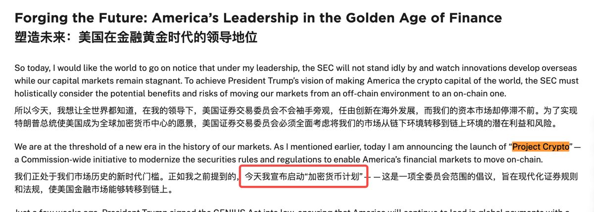7月31日,美国 SEC 新主席 Paul AtKins 发表了名为 《美国在数字金融革命中的领导力》的演讲,宣布了一项名为"Project Crypto"的全新计划。