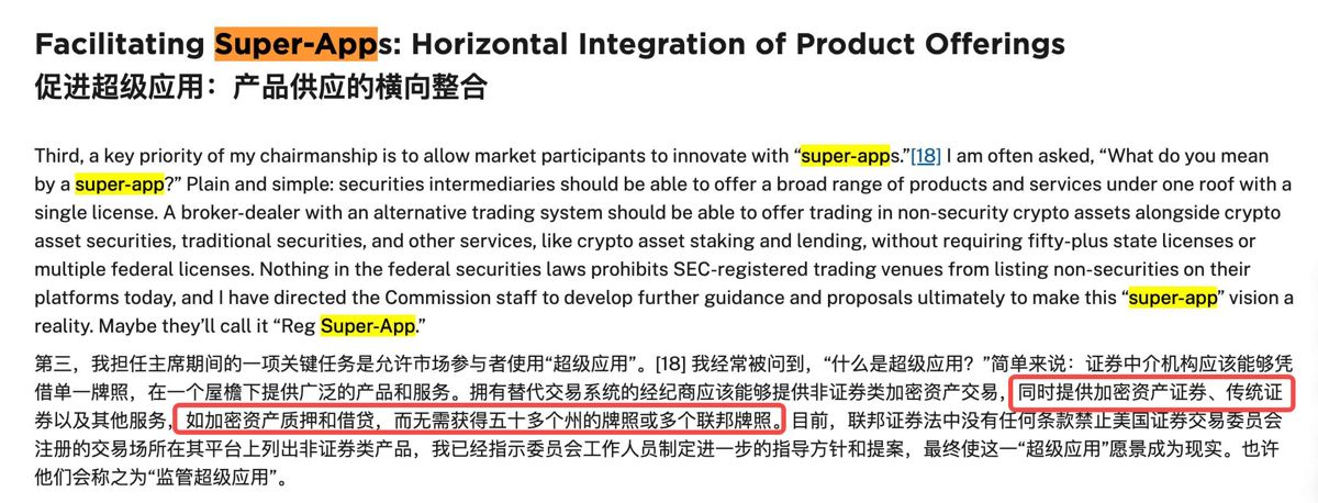 目前社媒上关于该计划的逐条解读有很多,在此不做赘述;但笔者认为其中最有价值的地方在于其允许金融机构创建"超级应用",在一个平台上同时提供传统股票交易、加密货币、DeFi服务等所有金融服务。