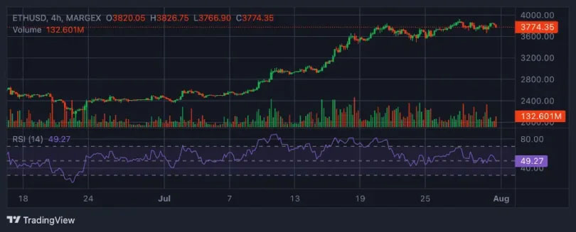 ETH 周一试图突破 4,000 美元,但未能成功,随后跌至 3,730 美元。但到周四,ETH 反弹至 3,800 美元以上。
