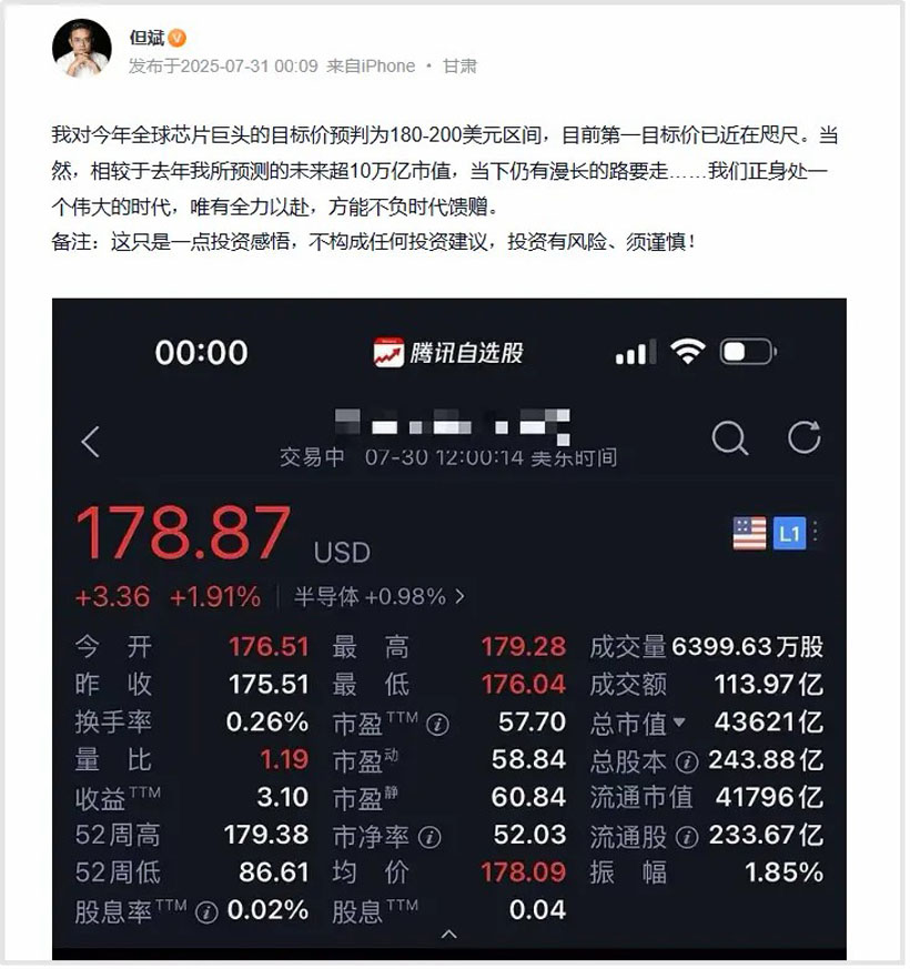 今天,但斌在雪球发布帖文称,“我对今年全球芯片巨头的目标价预判为180-200美元区间,目前第一目标价已近在咫尺。当然,相较于去年我所预测的未来超10万亿市值,当下仍有漫长的路要走……我们正身处一个伟大的时代,唯有全力以赴,方能不负时代馈赠。”