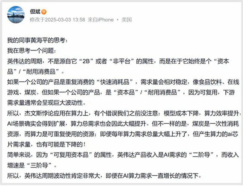 早在今年3月,但斌就分享了一段思考,核心意思就是:
