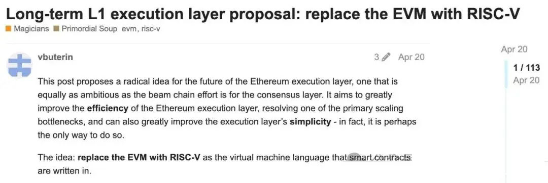 执行层也预计将发生重大变化。德雷克提出了一项路线图,彻底重新设计 EVM,采用对 SNARK 友好的指令集,同时保持与现有智能合约的兼容性。他提到 RISC-V 作为潜在的替代执行环境,提出了维塔利克·布特林自 2024 年以来一直在讨论的基于 RISC-V 的执行环境具体化的可能性。