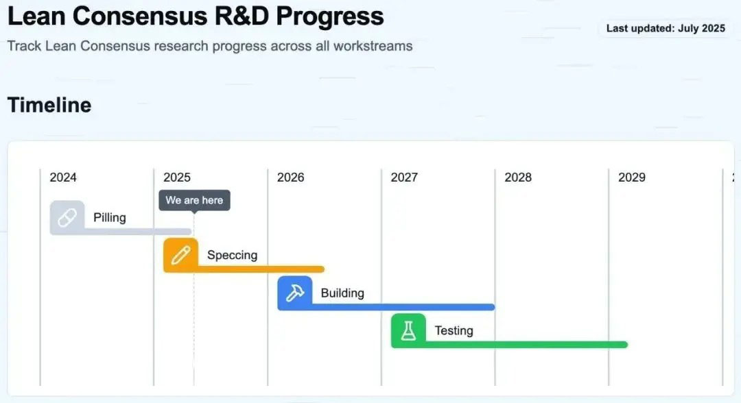随着精益以太坊的宣布,leanroadmap.org 网站也已上线,允许用户实时跟踪精益以太坊路线图的实施状态。根据该网站,向以太坊社区宣传升级需求的阶段即将结束,预计到 2026 年初完成任务优先级的确定和实施的准备工作。贾斯汀·德雷克在宣布 Beam Chain 路线图时估计实施可能需要长达 5 年,而精益以太坊的实施似乎目标在 2029 年初完成测试。考虑到 Beam Chain 仅涵盖共识变更,需要更新共识、执行和数据所有组件的新路线图预计将以非常快的速度推进。该网站不仅跟踪上述图表,还跟踪所有更新所需组件的详细实施进展,为整个以太坊社区而不仅仅是开发者提供可见性,宣称精益以太坊不仅是宏伟目标,而是在几年内将成为现实的未来。