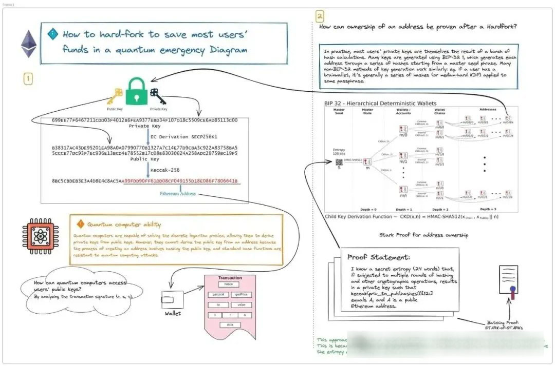 这一愿景背后是量子计算时代的到来。量子计算技术正在加速发展,例如谷歌的 Willow 量子计算机已实现 105 量子比特,NIST 建议在 2030 年前逐步淘汰现有密码算法,并在 2035 年前完全过渡到量子抗性标准。以太坊当前使用的基于椭圆曲线密码的 ECDSA 和 BLS 签名容易受到量子计算机的 Shor 算法攻击,众所周知,足够强大的量子计算机可能使当前密码系统失效。整个 Web3 生态系统多年来一直在讨论这个问题,维塔利克(VitALIk)在以太坊研究论坛上详细介绍了如果在升级到量子抗性密码算法之前发生量子计算机攻击,可以通过硬分叉实施的对策。
