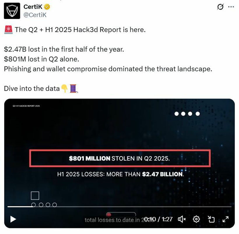 CertiK在6月30日的报告中表示,随着对更好网络安全解决方案需求的增加,2025年上半年加密货币黑客、漏洞和 诈 骗 事件激增至24.7亿美元,第二季度144起事件损失超过8亿美元,较第一季度下降52%。