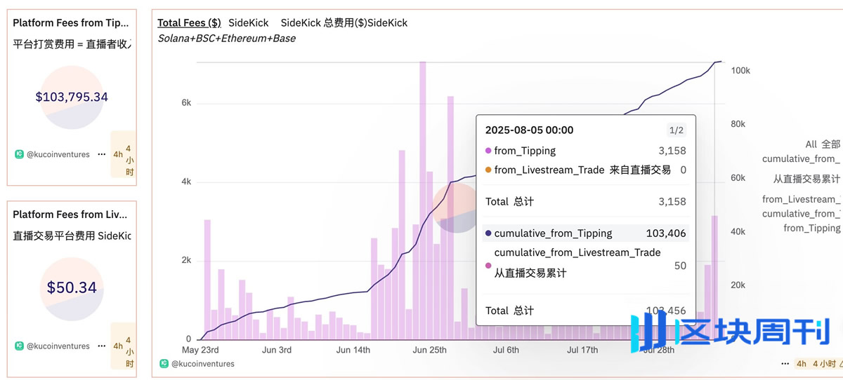 截止 8 月 6 日,Sidekick 平台直播打赏费用(直播者收入)仅为 10.37 万美元;8 月 5 日,Sidekick 平台直播打赏费用仅为 3100 美元左右。