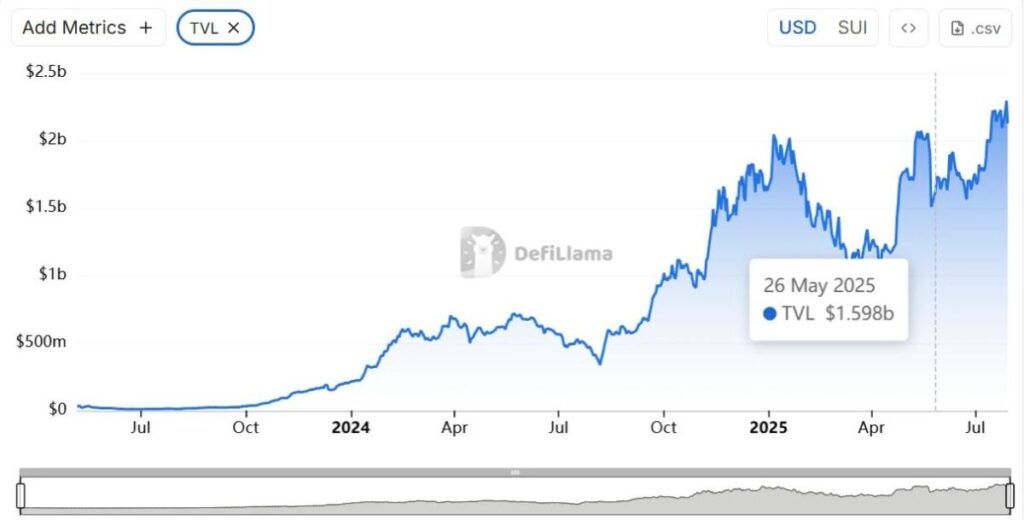 然而,2025 年 5 月,Sui 生态内重要 DEX 聚合器 Cetus 遭受攻击,导致超 2 亿美元资产流出,引发用户恐慌与流动性危机。这一事件短暂打击了市场信心,但也倒逼项目方迅速调整治理与安全策略。在几个月的技术重构与激励恢复下,Sui 生态重新崛起。根据 DefiLlama 数据,截至 2025 年 7 月底,Sui 链上 TVL(总锁仓量)已超过 20 亿美元,显示其恢复力远超市场预期。