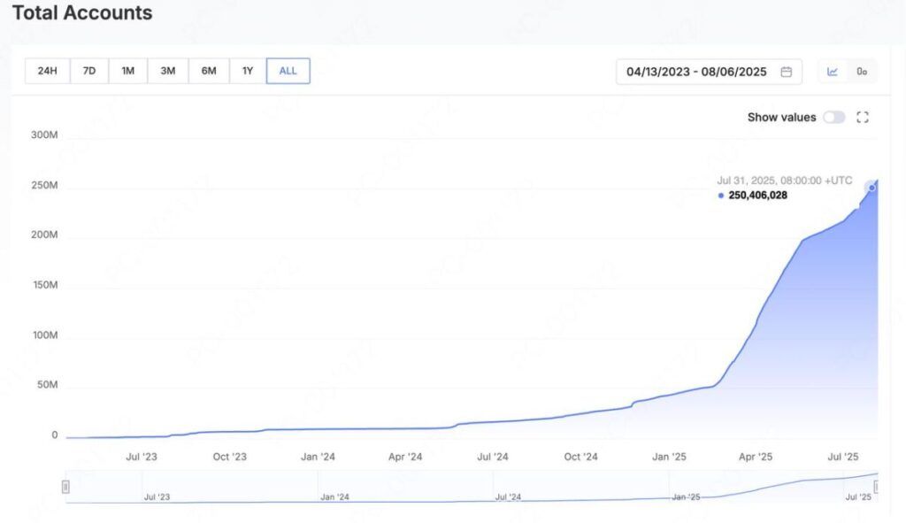 自 2023 年上线以来,Sui 用户增长呈指数级上升趋势。截至 2025 年 7 月 31 日,链上累计创建用户地址已突破 2.5 亿。尤其是在 2025 年 2 月之后,活跃用户数爆发式增长,从月活约 1,000 万跃升至 4,000 万以上,增幅超过 4 倍;日新增钱包也从 15 万跃升至 100 万,生态活跃度大幅提升。