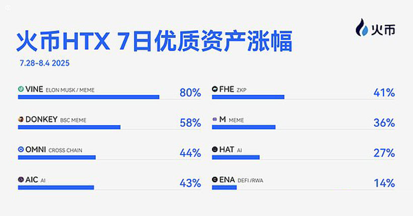 7月28日至8月4日,全球加密市场持续波动,热点叙事快速轮动。本周火币HTX上新资产中,Meme、AI、隐私计算、跨链以及RWA等赛道表现突出,财富效应持续释放。这是火币HTX 7月以来连续第五周的资产涨幅表现,再次印证火币HTX在优质项目甄选上的前瞻布局,持续助力用户捕捉市场新周期机会。