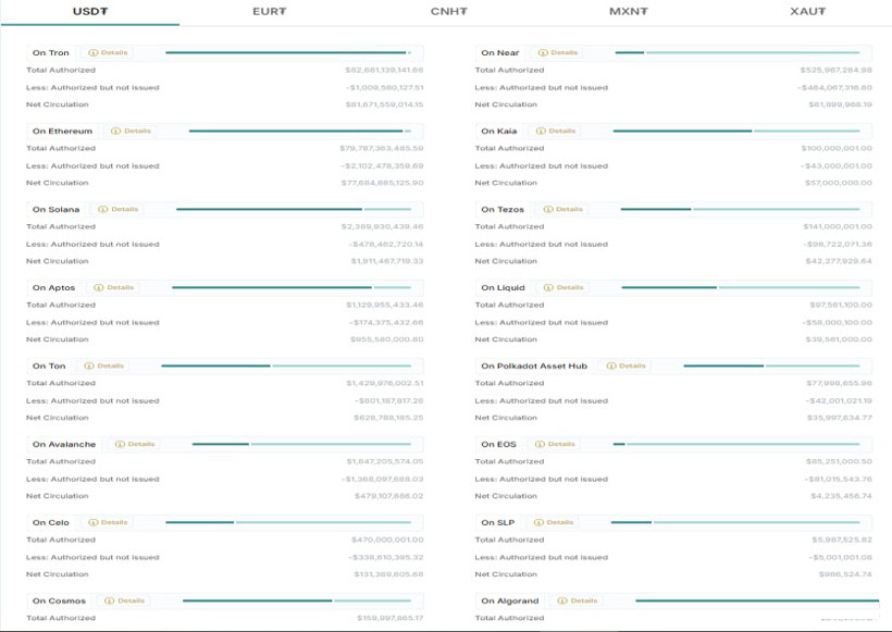 它广泛分布在 Tron、Ethereum、BNB Chain、Solana 等多个主流区块链上,尤其是在 TRON 链上的应用最为活跃,占总发行量的一半以上。