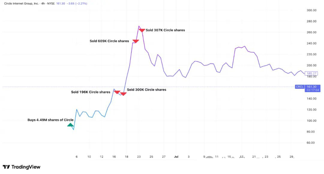 ARK 在股价达到顶峰前一周开始卖出。总共,ARK 卖出了约 150 万股,占其总持股的 33%,价值约 3.33 亿美元的 Circle 股份,在股价飙升期间。这意味着在 Circle 华尔街首秀不到三周的时间里,ARK 在这些股份上录得了超过 2 亿美元的账面利润,收益率达 160%。