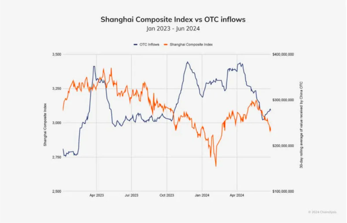 图2 2023年1月至2024年6月上证综合指数与OTC流入量比较-Chainalysis