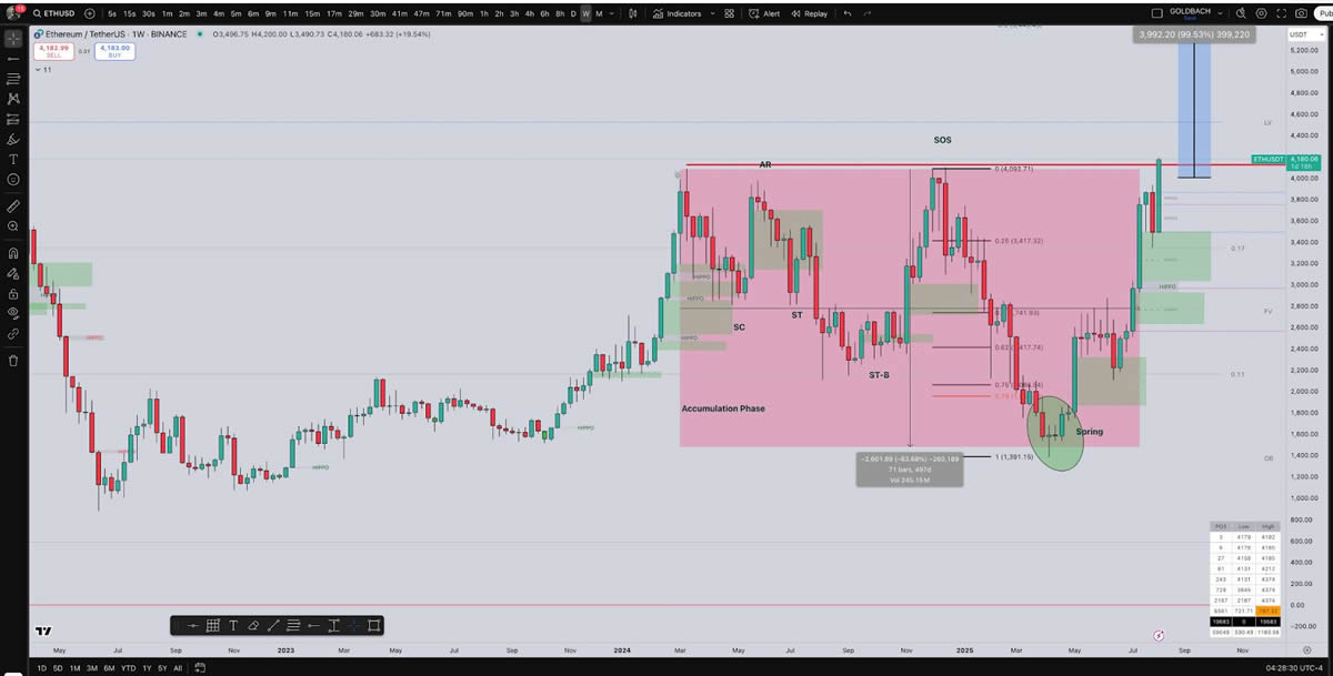以太坊周线呈现经典的威科夫吸筹结构:2024年-2025年在1,750-4,081美元区间反复震荡,形成“弹簧效应”(Spring)。8月初突破4,200美元确认“力量标志”(SOS),进入上升加速阶段。