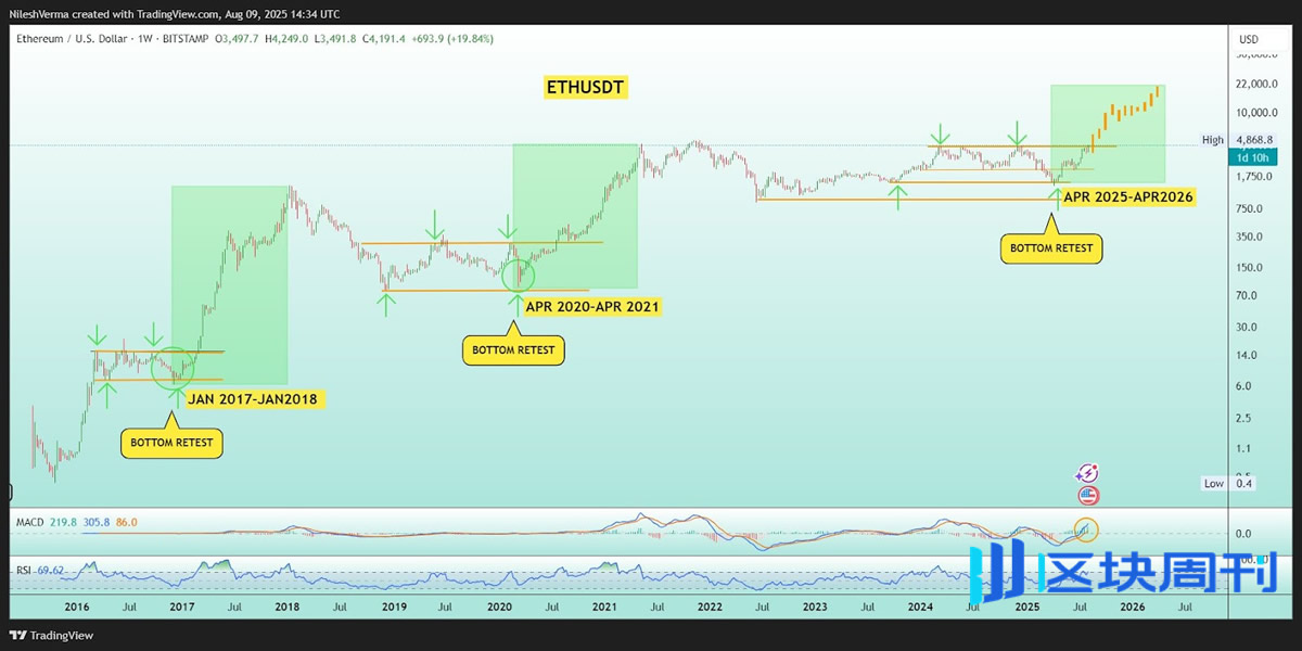 Nilesh Verma发现以太坊正重演2017年1月和2020年4月的关键分形:在重新测试主要底部(2025年4月1,750美元区域)后开启抛物线上涨。前两次反弹幅度分别达8,000%和950%,持续时间约12个月。若分形延续,本轮上涨将持续至2026年4月,保守目标10,000美元,乐观情形上看20,000美元。