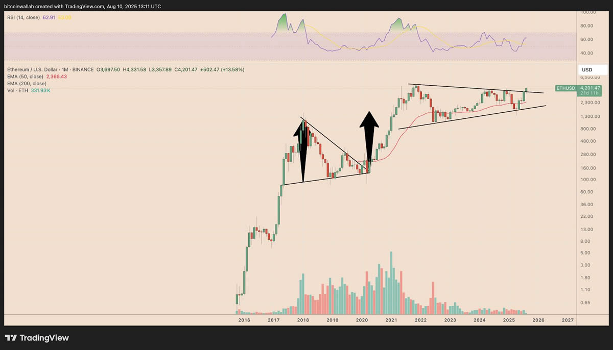- 上升三角形:MikyCrypto Bull指出更宏大的上升三角形结构,突破4,000美元后目标直指16,700美元。历史分形强化了这一预期——2020年4月类似突破后,以太坊上涨950%并超额达成目标。