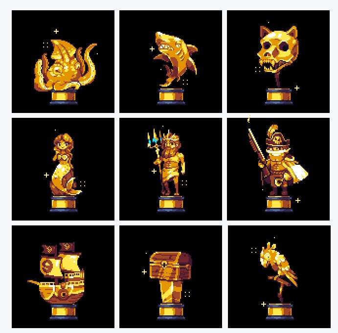 YOU THE REAL MVP 既是NFT 系列,也是针对Memeland 生态系统菁英成员的专属团体。它的设计类似于闪闪发光的金色奖杯,代表Memeland社区的最高级别群体。 NFT 由不同的人物组成:克拉肯、宝藏、鲨鱼、鹦鹉、骷髅、海盗、船、美人鱼和波塞冬。