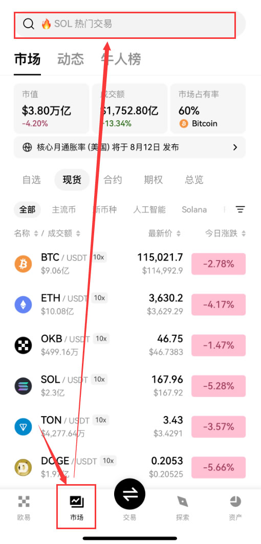 2、注册完成之后,下面打开OKX app(官方下载),点击【市场】上方的搜索框;