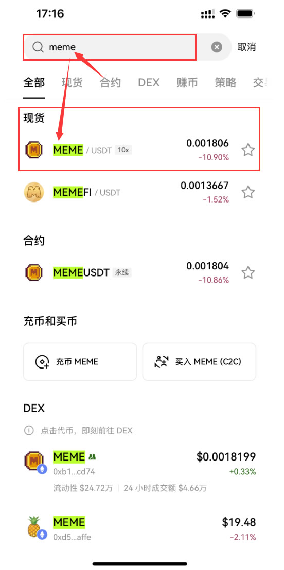 3、在搜索框里输入【MEME】,这时下方会出现MEME/ USDT,选中它。