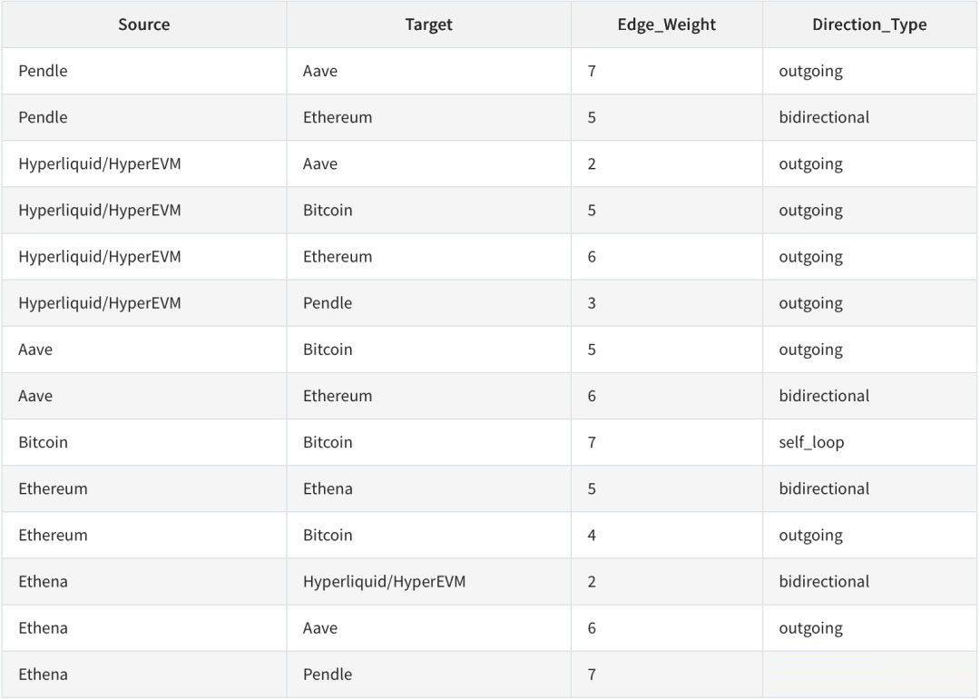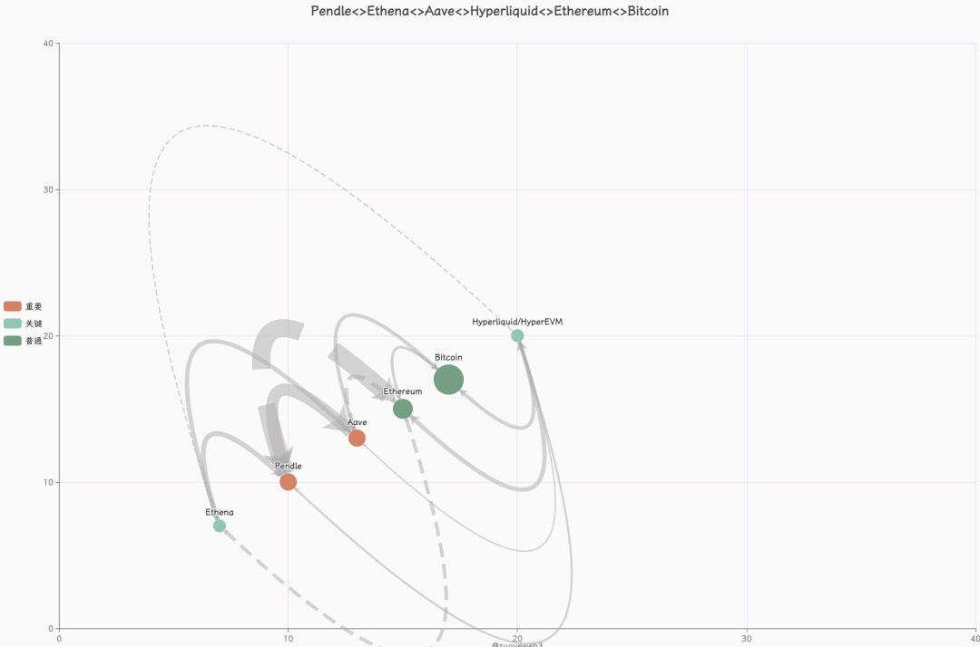 Pendle/Aave/Ethena/Ethereum/HyperEVM/Bitcoin 是链接最强的六个协议,任意两者之间的关系都可以相互耦合,最多需要额外一个协议或资产链接。