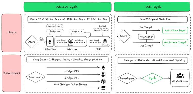 降低跨链转移成本:通过让用户在单个池中共享来自所有链的流动性,Cycle Network 消除了对复杂的跨链操作和多个链间桥的需求。