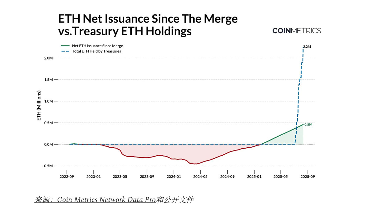 自 2022 年 9 月的“合并”以来,以太坊共发行 244 万枚 ETH,销毁 198 万枚 ETH,净供应增长 45.43 万枚 ETH。而仅自 7 月起,ETH 国库公司就累计持有 220 万枚 ETH,远超同期的净新增发行量。