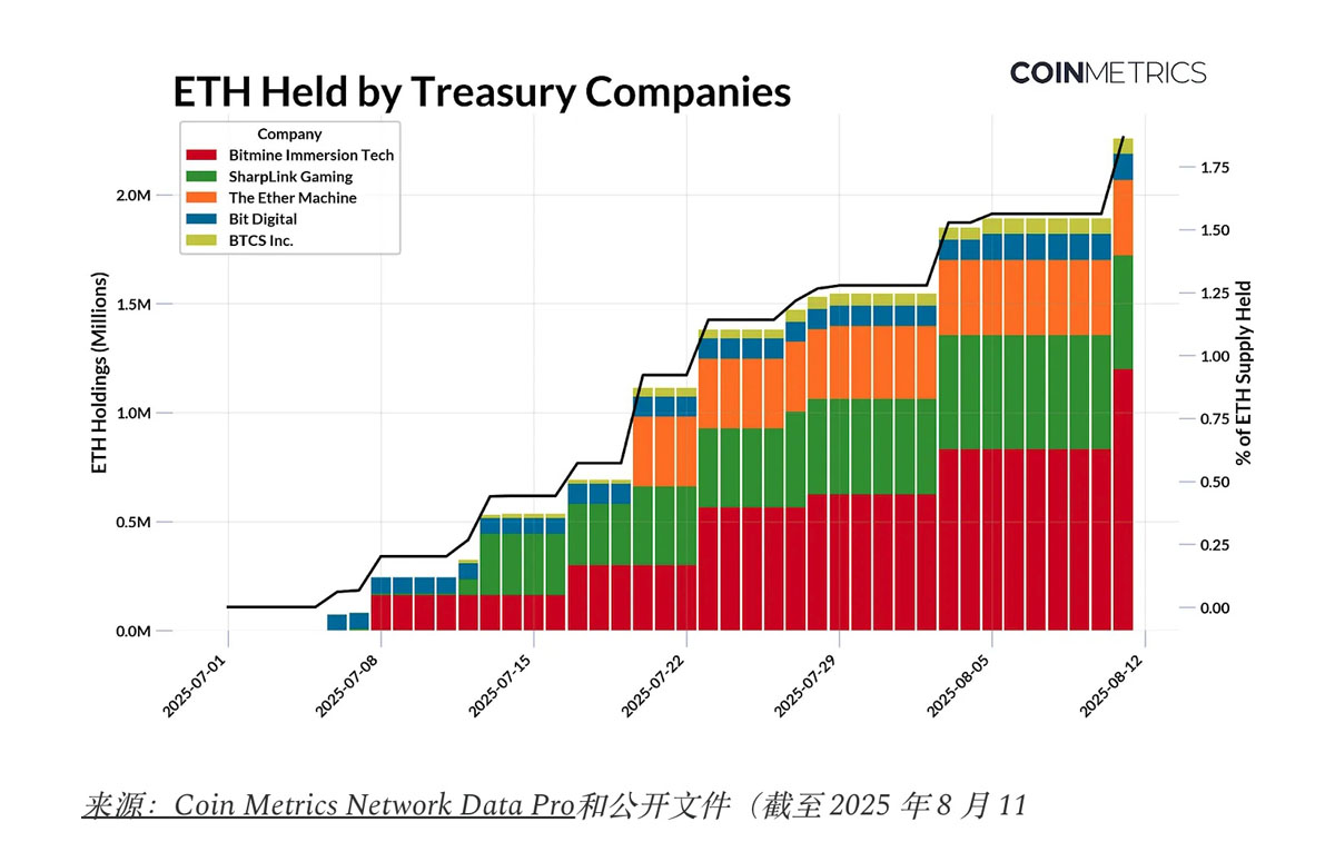 - 以 ETH 为核心的数字资产国库正在快速扩张,仅两个月内就累计了 220 万枚 ETH(占供应量的 1.8%),造成供需失衡。
