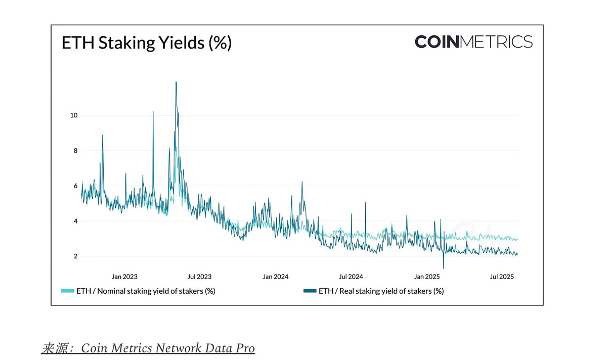 以太坊目前通过质押奖励提供 名义年化 2.95%、实际年化 2.15%(通胀调整后) 的收益,用于保障网络安全。这能让国库公司在标的资产价格上涨的同时,获得稳定的现金流收入。例如,假设目前国库公司持有的 220 万枚 ETH 中有 30% 按当前约 3% 的名义收益率、以 4,000 美元/枚 的价格进行质押,年收入可达约 7,900 万美元。虽然质押资金的增加可能压缩收益率,但影响较小,因为以太坊的奖励率会随着总质押量的增加而逐步递减。