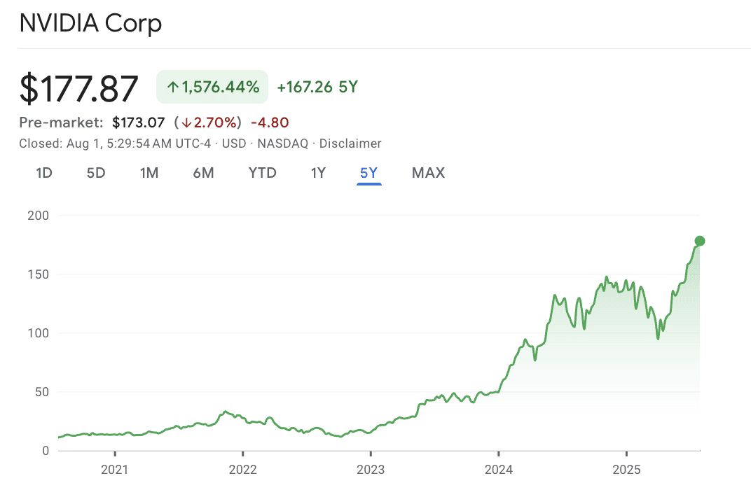 NVIDIA的股价在过去五年增长了1,576% | 资料来源:Google Finance