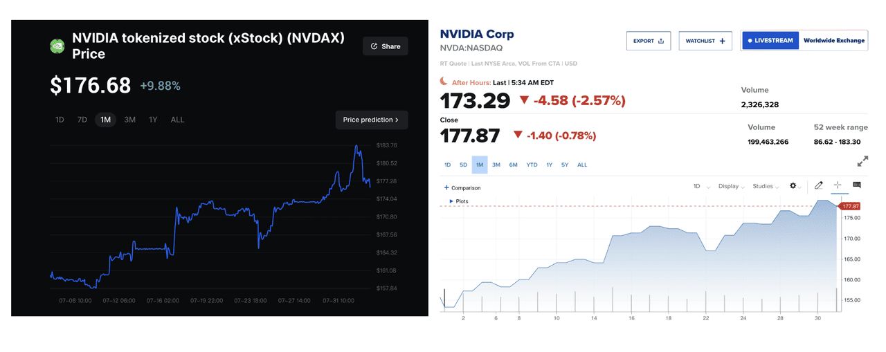 传统的NVIDIA股票(NVDA)与代币化版本的NVDAX追踪相同的基础资产,但交易体验却非常不同。传统股票在如NASDAQ等受监管的交易所交易,这些交易所有固定的交易时间,并且需要经纪帐户。结算通常需要几天才能完成,且投资者通常需要购买整股才能参与。虽然这样提供了完整的所有权权利,包括分红和投票,但也为小型投资者以及非美国市场的投资者设置了障碍。