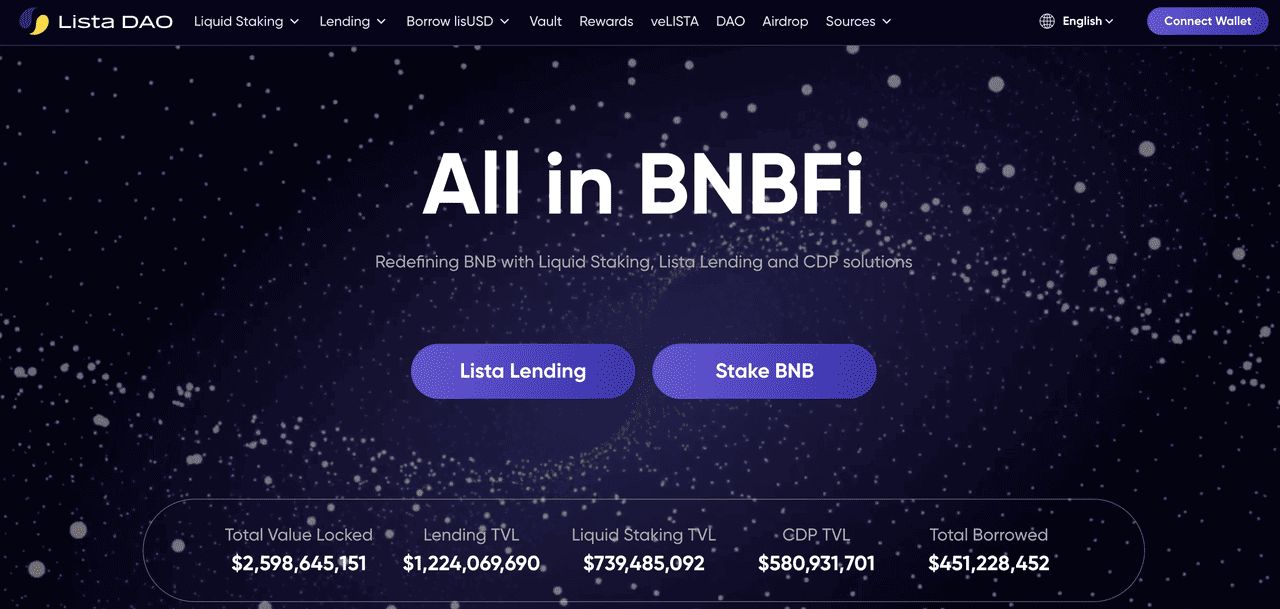 Lista DAO 作为一个开源的去中心化稳定币借贷协议,通过其抵押债务头寸(CDP)系统提供lisUSD,使得用户能够以BNB、ETH、slisBNB 和wBETH 等各种加密资产进行借贷。该协议主要集中在三个领域:为BNB持有者提供液态质押解决方案、稳定币借贷功能,并建立BNBFi生态系统,赋能持有者赚取机会,包括成为首个在Binance Launchpools中得到DeFi BNB资产认可的协议。这一独特的集成使得用户能够在获得链上收益的同时,参与Binance生态系统的奖勋。
