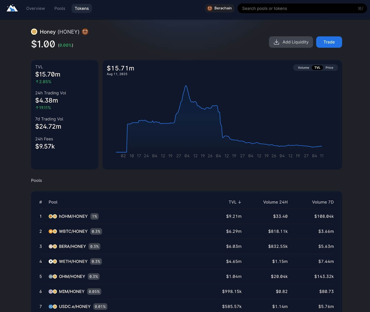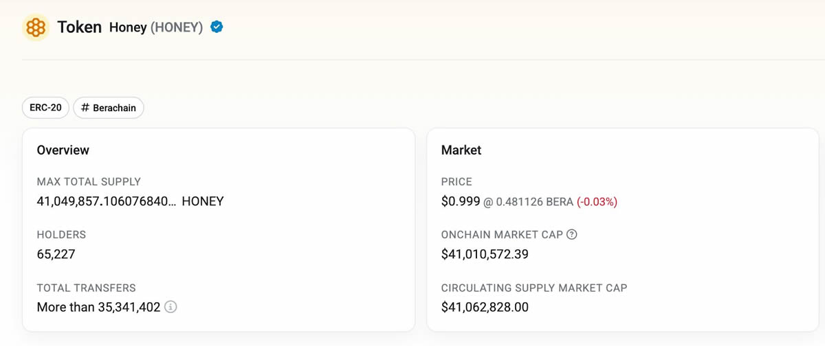 DeFi 生态系统原生稳定币的稳定性和深度整合,往往是衡量其整体健康状况的精准指标。对于 Berachain 而言,HONEY 稳定币担当了这一关键角色,它的历程引人入胜,既展现了脆弱性,也展现了最终的韧性。HONEY 远不止于维持其锚定汇率,它已与生态系统的经济结构紧密交织,根据 Berascan 的数据,目前其流通供应市值约为 4100 万美元。
