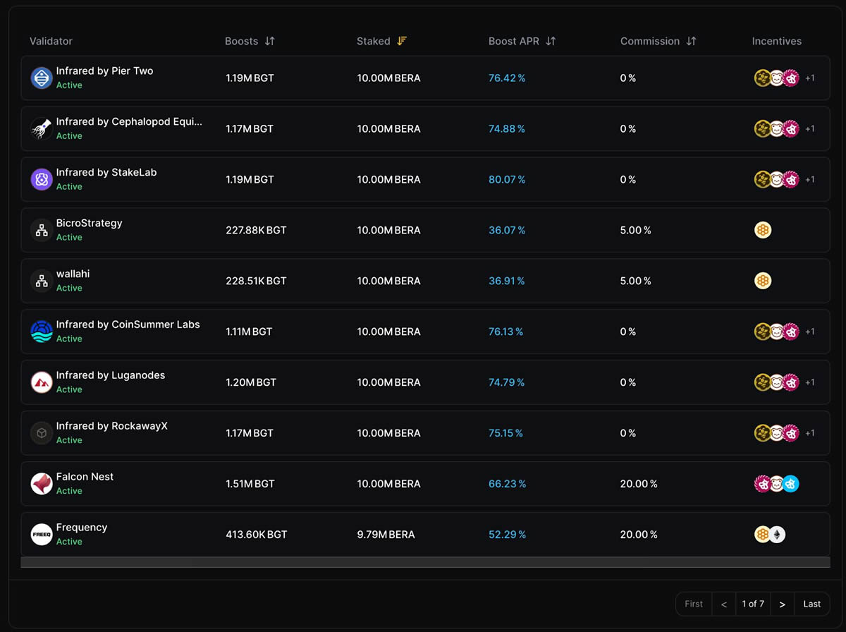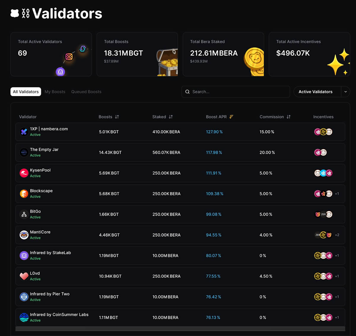 Berachain 的设计意义深远。它有机地将流动性提供者从被动参与者转变为网络方向的最终仲裁者,将惰性资本转化为对区块链集体安全具有积极、生产性的权益。链上数据有力地证明了这一模式正在蓬勃发展。截至 2025 年 8 月,共有 69 位活跃验证者为网络提供了强有力的保障。更值得一提的是,约有 1831 万 BGT(约合 3800 万美元)被委托给网络。