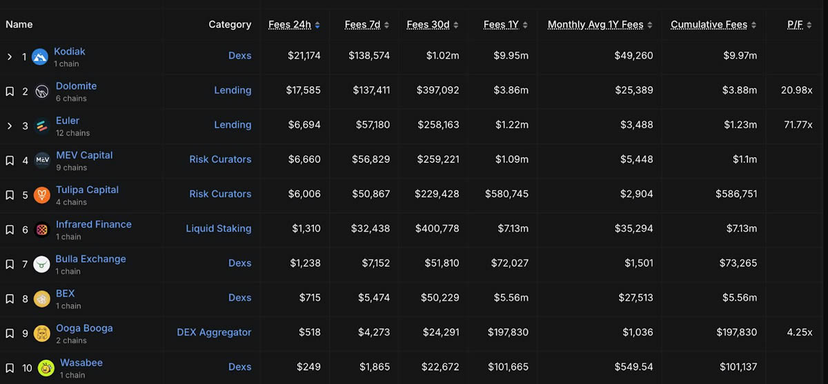 旗舰去中心化交易所 Kodiak 紧随其后,其流动性池中获得了约 11.2 亿美元的资金。纵观 Berachain 生态系统,Kodiak 扮演着更为关键的角色。它不仅仅是一个被动的资金库,更是一个充满活力、高速交易的市场。其流动性池采用先进的集中式流动性设计,展现出卓越的效率,每日交易量经常达到其总锁定价值 (TVL) 的 20% 至 25%。