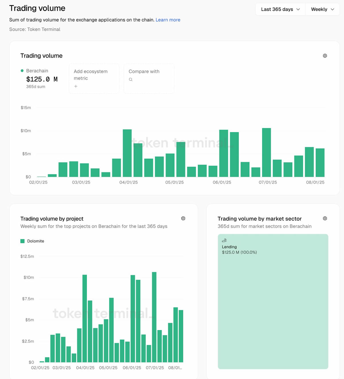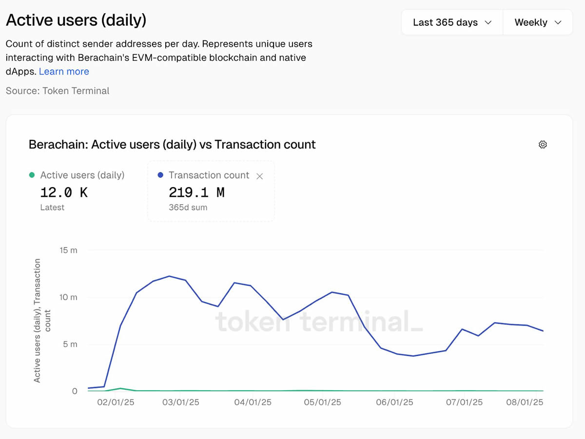 在2025年3月达到顶峰时,链上数据平台报告的日活跃用户(DAU)超过17.5万,而网络本身一年处理的交易量超过2.19亿笔。就原始用户参与度而言,该平台的首次亮相堪比一些最成功的平台。上一轮备受赞誉的平台有一个关键的区别:从第一个区块开始,Berachain的活动就与其DeFi原语紧密相连。
