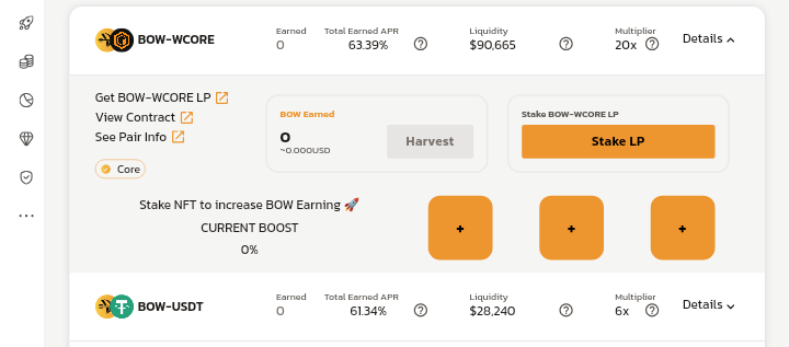 流动性池允许用户通过添加代币来提供流动性,而用户会获得 LP 代币(例如,BOW-CORE LP 代币)作为回报,这些代币代表用户在流动性池中的份额。流动性提供者可获得部分交易费奖励,但也面临无常损失的风险。例如,每笔交易会收取 0.2% 的费用,其中 0.10% 会加入交易对的流动性池。