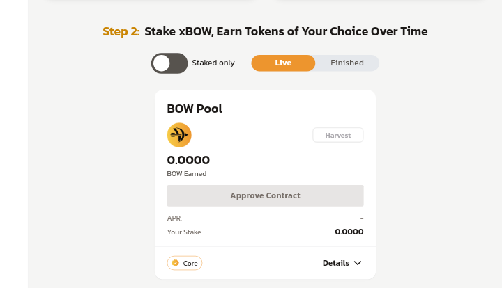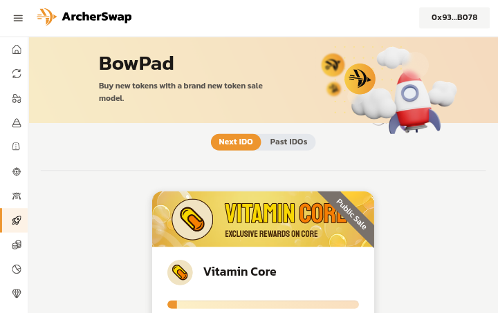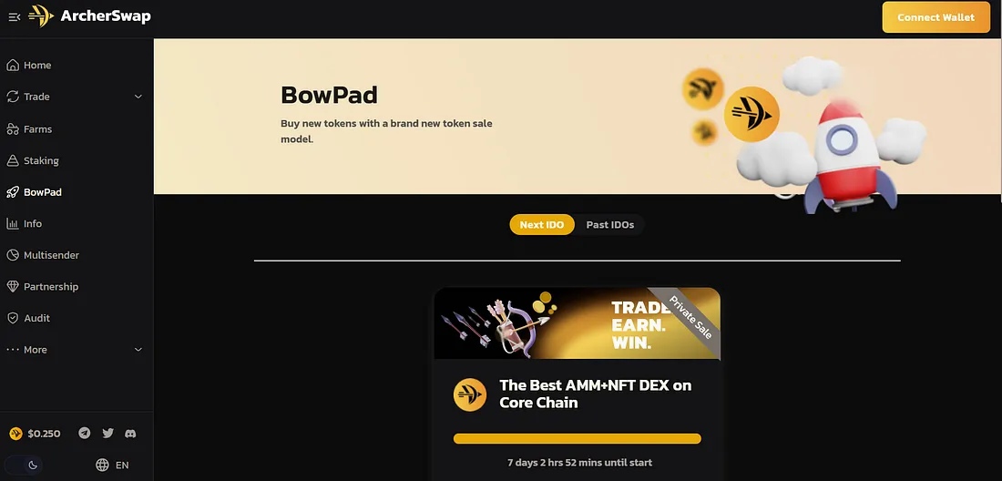 BowPad 是 ArcherSwap 的新项目启动板。它帮助新项目发行代币、获得流动性并通过 CORE 融资。代币销售采用溢出模式,每个钱包的购买上限为价值 5,000 美元的 CORE。参与者需在代币销售开始前从中心化交易所购买 CORE 或确保钱包中已有 CORE。