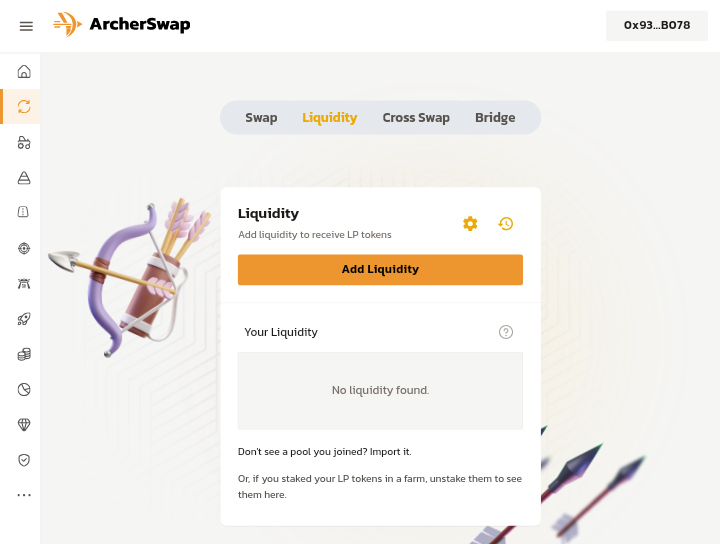 2.前往流动性池:进入 Archerswap 的流动性池。