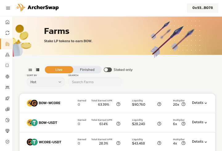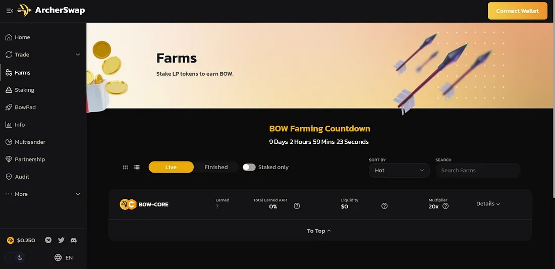 ArcherSwap 的高 APR 农场让用户质押 LP 代币以获得丰厚的收益。这些农场提供有吸引力的年化收益率(APR),激励用户参与收益农场并为平台提供流动性。