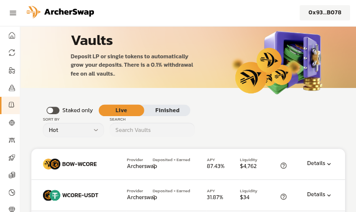 ArcherSwap 的金库让用户可通过自动收益优化来存入 LP 代币并赚取额外奖励。金库使用智能合约策略自动复投资产,这使得 LP 代币持有量随时间增加。该过程包括收获奖励、将一半收益兑换为配对资产并添加流动性。金库提供了比传统收益农场更高的回报,减少了用户操作和 Gas 费,并保障利润。没有充值费,标准提现费为 0.1%。