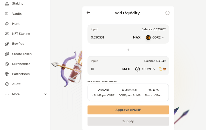 1.连接钱包:确保您的 MetaMask 钱包已连接到 Core Chain 网络和 Archerswap 平台。