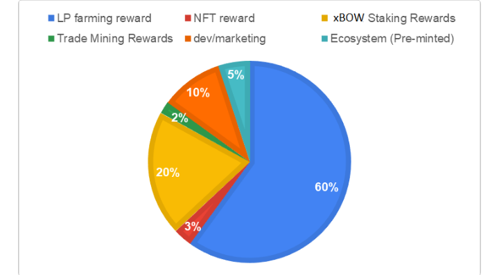 $BOW 代币是 Archerswap 的原生实用代币,是其生态系统的核心组成部分。它用于平台上的交易、质押和奖励。$BOW 总供应量为 18,921,600 枚,其分配如下: