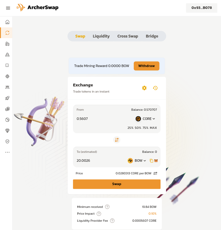 然而,Archerswap 解决了这些挑战,这是通过提供一个用户友好且安全的 Core Chain DEX 实现的。Archerswap 带来了低滑点、高流动性和直观的界面,提升了交易体验。同时,它实施了强大的安全措施,以保护用户资产。Archerswap 的解决方案促进了去中心化金融(DeFi)在 Core Chain 上的采用和易用性。