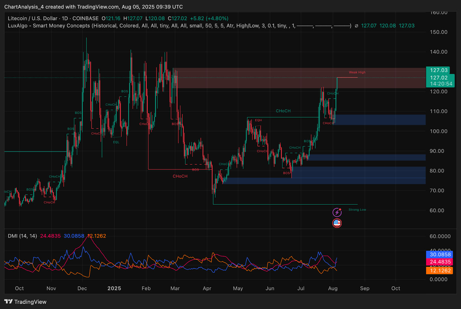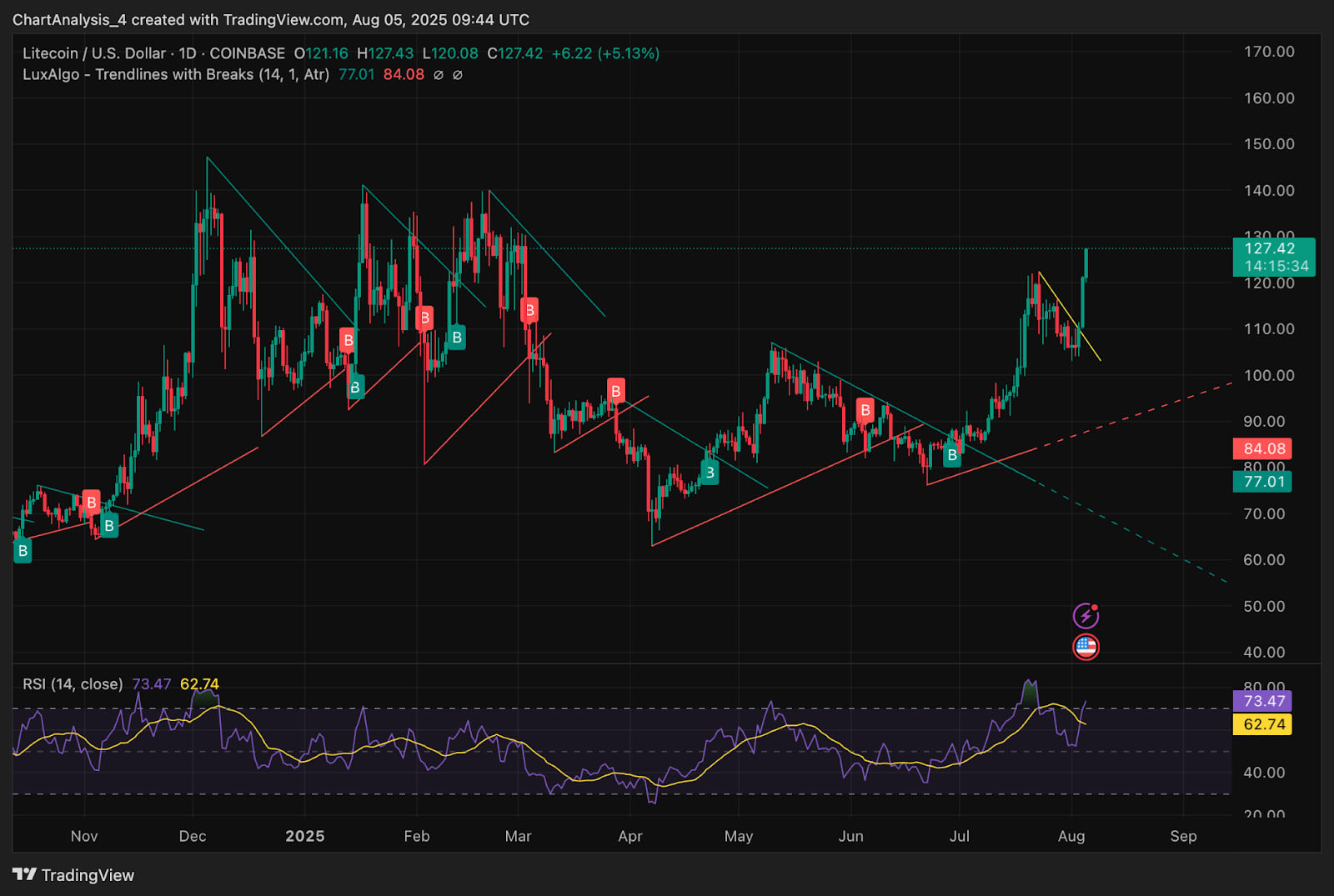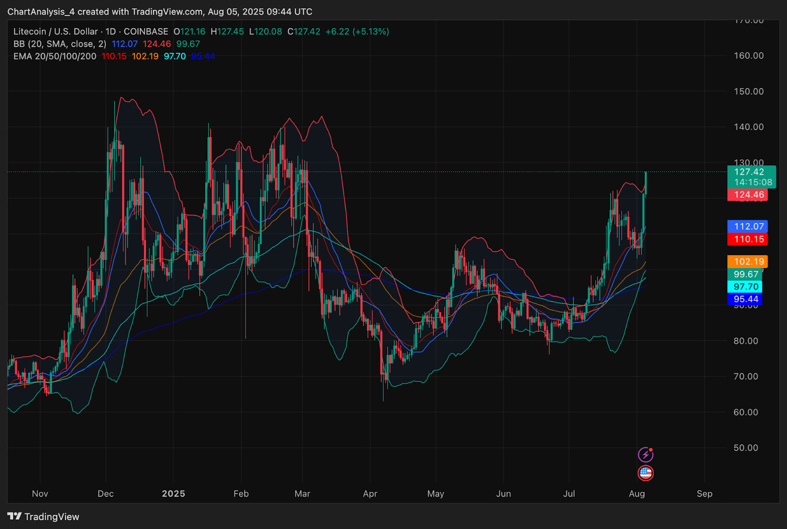 布林带正在扩张,LTC 突破了 124.46 美元的上轨。价格仍远高于所有主要 EMA,包括 20 日 EMA(110.15 美元)和 50 日 EMA(102.19 美元),反映出看涨信号。突破趋势线图上多个“B”点标记的下降楔形形态,证实了持续的强势。价格目前已突破 7 月份的盘整高点,并正在测试之前的供应区域,下一个主要上限位于 148 美元附近。