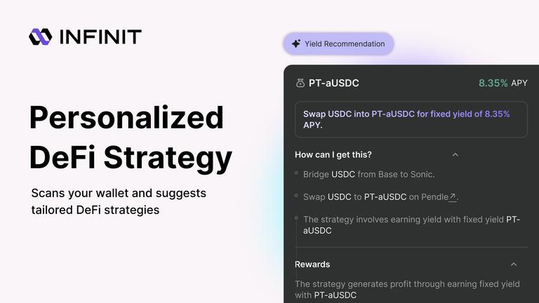 例如,INFINIT 会扫描用户的钱包,根据用户持有的稳定币和主流资产(例如 ETH、BTC 和 SOL)来推荐 DeFi 策略。用户还可以提出诸如“我想用我的 1 个 BTC 每月赚 1000 美元,该怎么办?”之类的问题,INFINIT 会提供切实可行的策略,帮助用户实现目标。