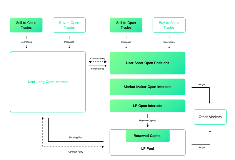 - 市场平衡:为了维持市场的多空平衡(约50:50),当市场倾向于某一方向(例如多头)时,LP 会暂时持有相反的空头部位,并逐步将其转移给新的空头交易者。