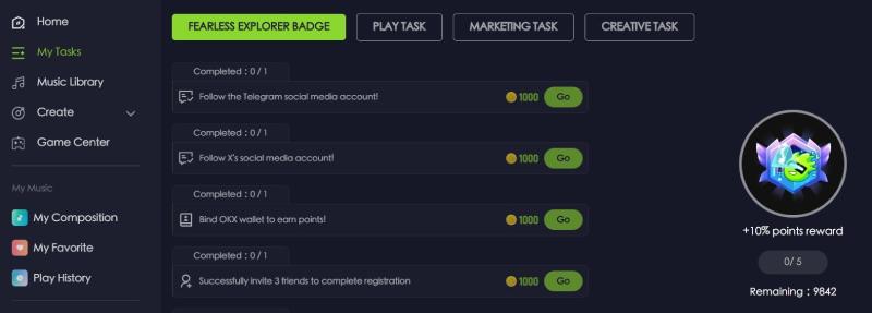 “播放任务”板块的任务需要用户听歌、点赞、评论才能完成。点赞和评论会自动累积,达到一定量后,系统会自动将积分添加到用户的账户中。