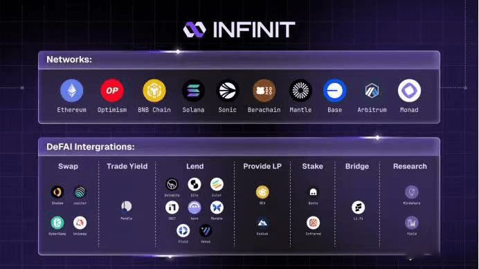 INFINIT与多个区块链网络集成,使用户能够通过单一界面访问不同链上的DeFi机会。这种聚合减少了复杂性,为用户提供了对DeFi协议的更广泛访问。
